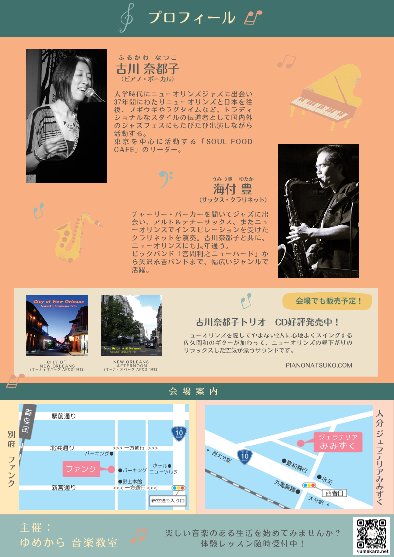 ニューオリンズスタイルピアノの第一人者・古川奈都子と幅広いジャンルで活躍する海付豊のサックスによる、心も体も ♨あったまる♨ 演奏をお楽しみください。